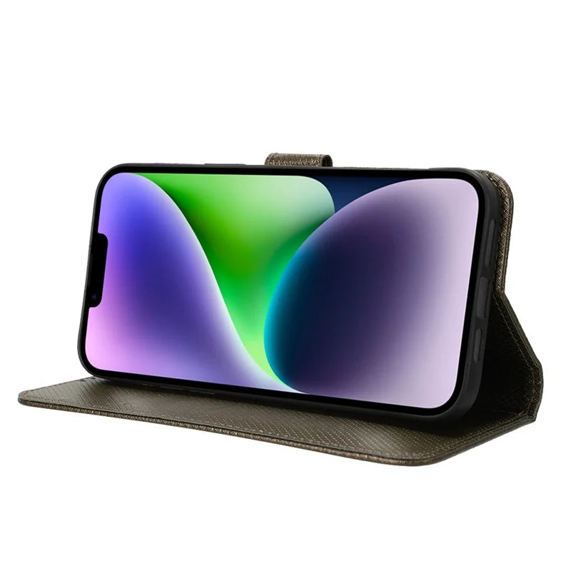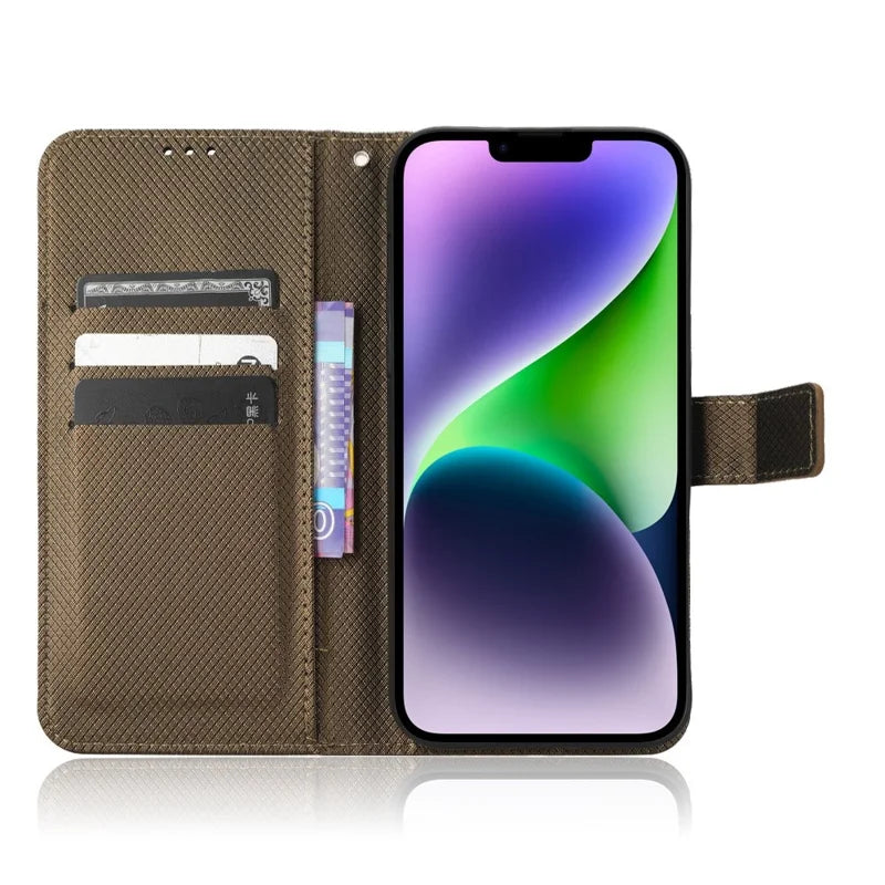 For iPhone 14 Max 6.7 inch Full Protection Diamond Texture Wallet Leather Case Stand Shockproof Phone Cover with Magnetic Clasp - Brown
