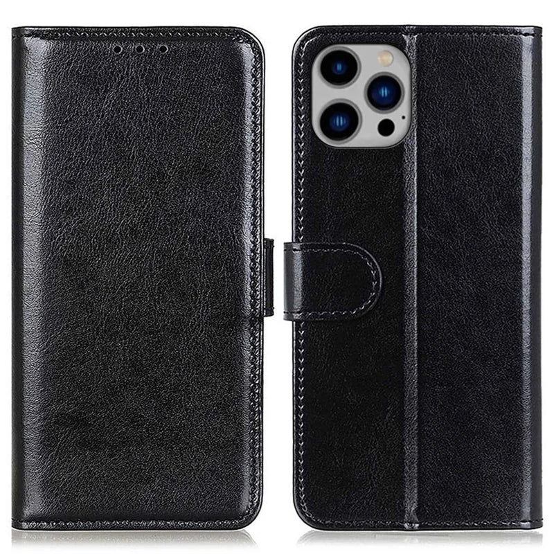 For iPhone 14 Plus 6.7 inch Crazy Horse Texture Phone Case Shockproof Stand Cover PU Leather Wallet Ant-drop Magnetic Protective Shell - Black