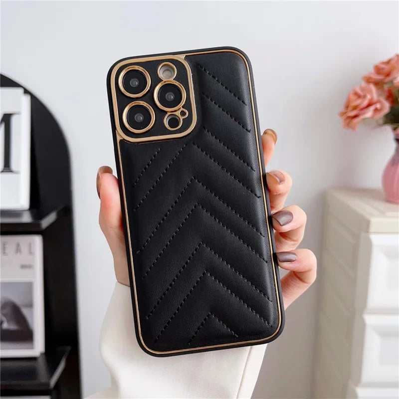 V-shape Grid Stitching Line Decor Phone Case for iPhone 14 Pro Max, Electroplating PU Leather Coated TPU Cover with Precise Cutout Lens Protection - Black